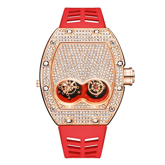 PINTIME Luxury Iced Out Diamond Stainless Steel Quartz Wristwatches Silicone Strap Tonneau Clock Relogio Masculino